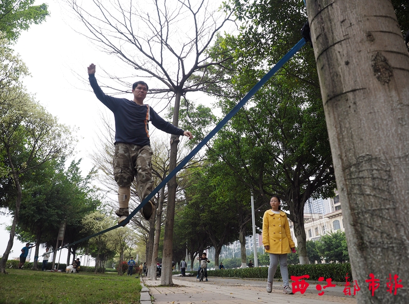 ???? 3月15日下午,一名戶(hù)外愛(ài)好者在西堤路綠化帶的樹(shù)木之間走扁帶,引來(lái)路人的觀看。