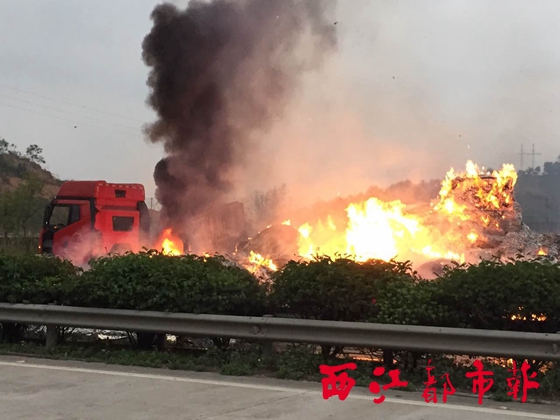 3月19日清晨5時許,廣昆高速公路岑溪段一輛貨車發生自燃,現場一片火光沖天。