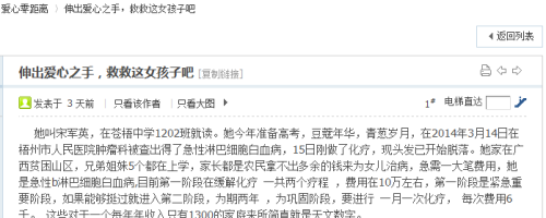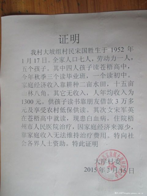 宋軍英,就讀于蒼梧中學,今年春學年,她和同學們一起投入緊張的復習當中,用自己的努力去追逐自己的大學夢。她家庭并不富裕,家里兄弟姐妹五人,她排第三,哥哥和姐姐都在讀高三,一個弟弟讀高一,另一個弟弟讀初三。家里只有一兩畝水田,現母親在餐廳做服務員,其父在家里務農。宋軍英一家靠父母種田和打散工的收入維持簡單的生計,日子過得非常艱難。宋軍英珍惜著自己的這份幸福,乖巧懂事,孝順父母,認真學習。可是就在夢想快要接近現實的時候,卻來了個晴天霹靂。3月15日,宋軍英不幸被確診患了急性淋巴細胞白血病,生命危在旦夕。而突來的噩耗對于這個困難的農村家庭來說,是雪上加霜,高昂的醫療費用,讓宋軍英同學一家束手無策,只好求助于社會。