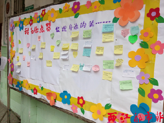 民主路小學學生們的點贊小紙條貼滿了“我為你點贊——發現身邊的美”的大展板。