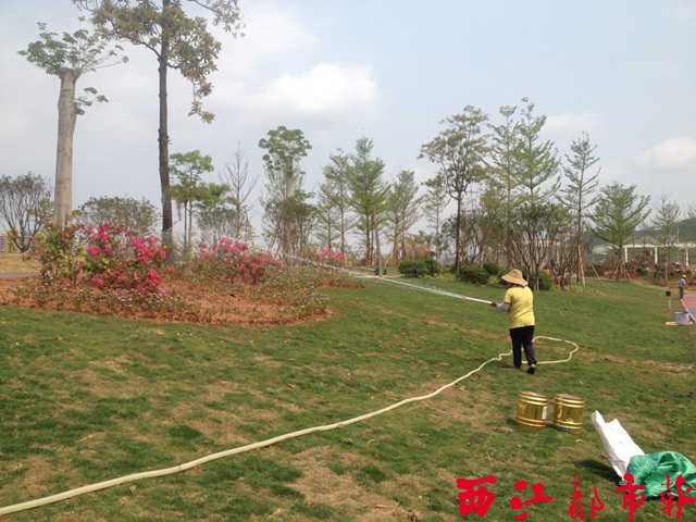 ????西江都市報訊 (記者 謝韻 文并攝) “西岸景觀帶綠化種植已經完成95%以上工程量,預計4月底前基本完成?!比涨埃浾咴诘诹鶎脧V西園博會建設現場采訪時,管理協調項目部綜合組組長許鳴向記者如是說。據了解,目前施工方除了抓緊土建工程外,也在同步進行園區(qū)綠化工作。