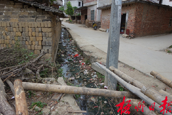 ??? 在龍圩區大坡鎮河步村龍咀組,村民屋門前一條綿延數百米的污水溝里布滿玻璃瓶、塑料盒、食品包裝袋等垃圾,十分臟亂(攝于4月8日)。梁萍 攝