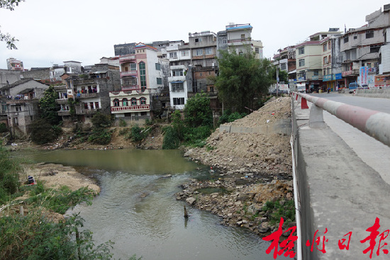 ????在龍圩區大坡鎮鎮區大坡橋附近,河岸護坡上傾倒有大量的生活垃圾和建筑垃圾,一些垃圾掉落河中,近岸的一些水泡子里可看到水體發黑(攝于4月8日)。梁萍 攝