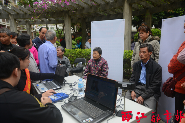 ????4月8日,梧州市人力資源和社會保障局的工作人員,來到豐業花園小區,為參加社保的居民進行“人臉識別”電腦錄入工作。