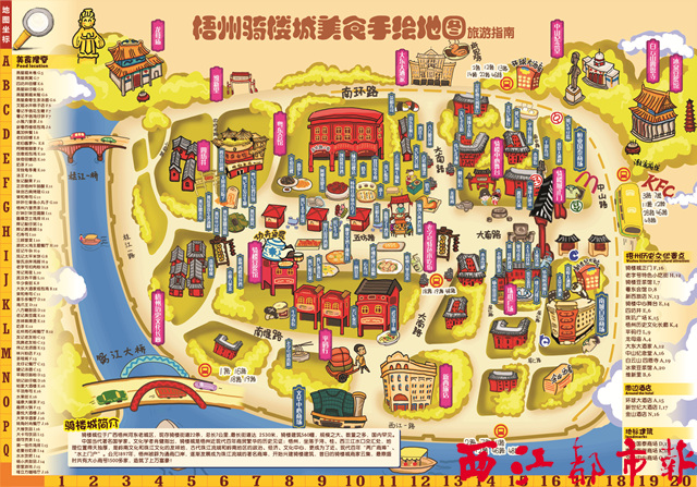 ????在這張地圖上,大街小巷里盡是鱗次櫛比的店鋪,從市井煙火到酒店廳堂,從小攤小店到老字號店,從梧州田螺的香辣到梧州龜苓膏的清涼……只要有梧州特色的騎樓城美食,都在這張地圖上匯集。明快的色彩對比、可愛的圖案搭配,手繪美食地圖讓人感覺既青春勃發(fā),又精致實用,外地游客和梧州市民看起圖來一目了然。