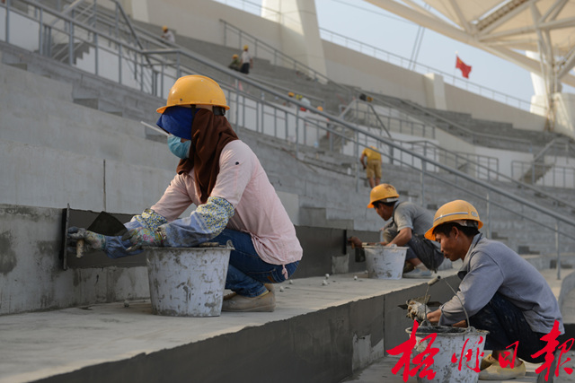 ????5月3日,施工人員在梧州市體育中心看臺上進行水泥蕩平。這是水泥跟膠水拌混二次蕩平工序,隨后將進行砂紙打磨,使座位平滑。