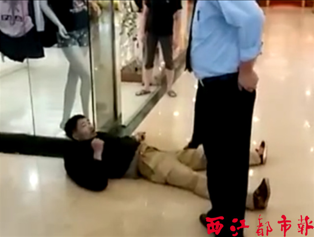 ????目擊者鐘先生拍下了該名男子與保安人員對話的經過。中午11時40分,一名男子躺在恒業國泰廣場一樓的服裝店門前,面對保安人員的勸告,他叫喊著“我進來商場是‘嘆’空調的”。男子的丑態嚇得市民避之不及。