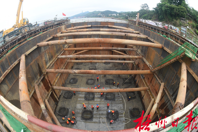 ????5月5日,在環城高速公路西江特大橋樁基礎工地,工人在高承臺底部開展清基作業。