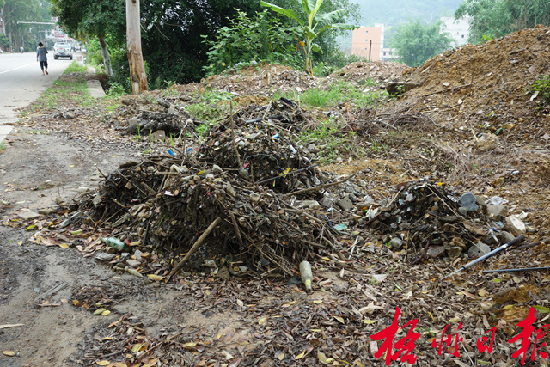 ????在岑梧二級路岑城鎮烏峽村路段,公路邊有數堆枯樹枝、生活垃圾、建筑材料、磚石、雜物組成的垃圾堆,影響鎮容鎮貌(攝于5月5日)。祝琳 攝