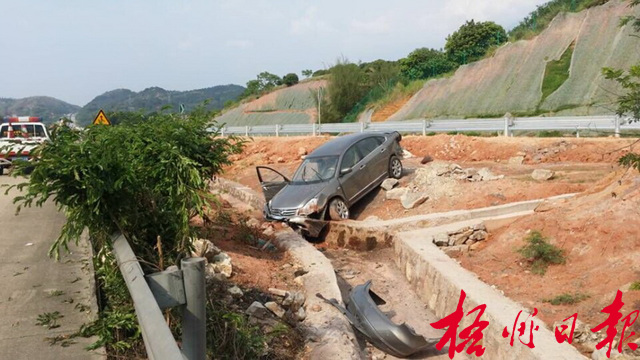 ????5月4日,一輛小轎車由梧州往玉林方向行駛至包茂高速洞心立交橋時突然沖出路面,造成車輛嚴重損壞,所幸無人員傷亡。