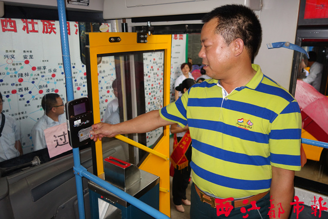 5月6日,一位藤縣市民使用金融IC卡乘坐公交車。 本報記者 龍天傳/攝