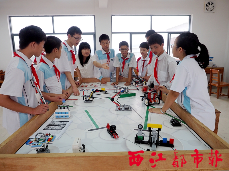 ????每天下午第八節課,在梧州市第十四中學的科技活動室里,十幾名中學生正在組裝、操控機器人,機器人靈活地前后左右移動……