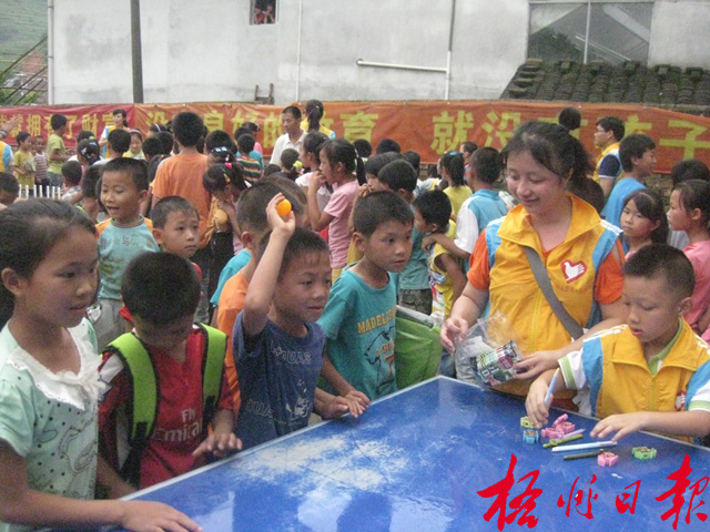 ????5月30日,廣東省中山市香暉園小學親子義工團成員在與黎垌小學學生做擲乒乓球游戲。