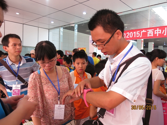 參賽的學生家長對兒童智能安全手表頗感興趣,并現場體驗智能手表功能。