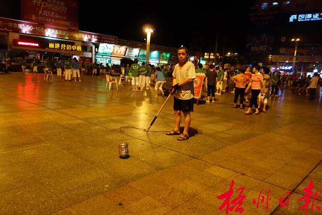 ????“啪—啪—啪”,晚上8時左右,打陀螺的抽打聲在鴛江麗港中心廣場一角響起,一位老人揚起胳膊奮力揮打桿鞭。由于桿鞭揮動會形成一個約2米直徑的圓圈,為了安全起見,老人每一次揮桿,都會回頭看左右路人,盡量避免桿鞭末梢碰及別人。