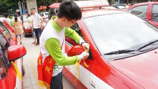 活動現場,志愿者為出租車系上“黃絲帶”。