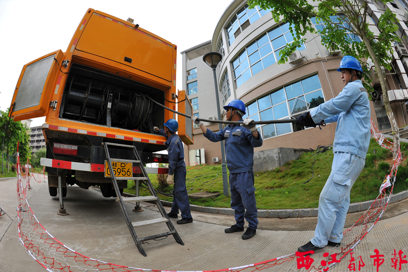 6月5日,供電局工作人員將從應急發電車中拉出的電纜,接入梧州高中高考考點用電線路中。