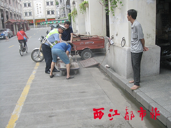 ??? 西江都市報訊 (記者 楊珊 通訊員 陳利) 為了方便自己,利用石墩、廣告牌、木板等障礙物私占公共停車位,是梧州市不少商家存在的違法行為,引起了市民的普遍反感。為此,萬秀交警大隊近日開展了專項整治行動,對商家私占公共停車位的障礙物進行強制清理,還“位”于民。
