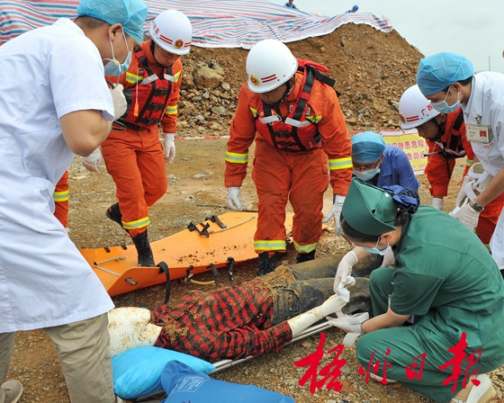 ?6月10日,在梧州市軍地抗洪救災搶險綜合演練中,消防官兵利用生命探測儀救出一名“被埋群眾”,并交由醫(yī)護人員進行緊急救治。孟亞西 攝