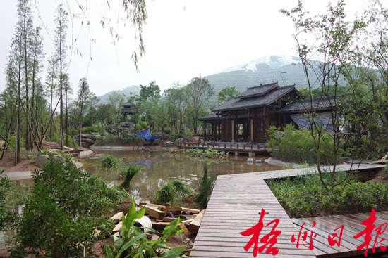 ????來到南寧展園,你會被一種獨特的民俗文化風(fēng)情和原生態(tài)山水歡歌畫卷所吸引。黑亮渾厚的仿古木老邕街牌坊和位于展園中心、同樣格調(diào)的干欄式主建筑相互呼應(yīng),給整個展區(qū)定下了鮮明的壯家山寨民俗文化特色主基調(diào)。展園里,以朱槿、杜鵑、茉莉、紫薇為主要花團(tuán)配以雕塑形成的景觀組團(tuán),以及層層跌落的溪流、變幻流動的綠島、隱約可見的小橋,還有遠(yuǎn)處極具壯鄉(xiāng)特色的連理亭,悠然展現(xiàn)出壯鄉(xiāng)民間對歌的美好場景和浪漫情懷,營造出屬于壯家幸福味道的生活氛圍。據(jù)了解,南寧展園的造園主題是“天下民歌,眷戀邕城”。再細(xì)細(xì)品看,就會發(fā)現(xiàn)展園里的景石、景墻、裝飾小物件等各處都有著對民歌文化的細(xì)心解讀,用心良苦地在詮釋著生態(tài)版的“大地飛歌”。