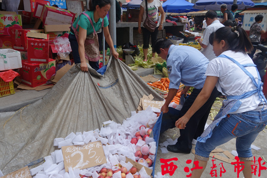 ????8點15分,邱宏進來到大塘市場西街入口處,并與另外三名隊友會合。此時,大塘市場周邊的主干道已被各類流動攤販擠得水泄不通。于是,邱宏進當(dāng)機立斷:“不能聽之任之,先勸動一檔再說?!彪S后,他環(huán)顧四周發(fā)現(xiàn),一名年紀(jì)較大的青菜販子正站在太陽底下極力地向路過群眾推銷自家果蔬,還不斷地用手擦著額頭流下的汗。
