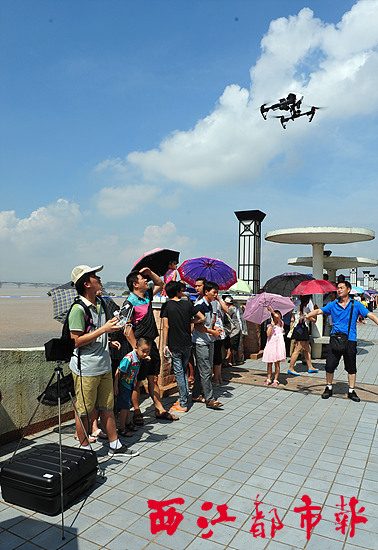 龍舟賽當天,一群攝影愛好者用小型遙控飛機為這次比賽進行航拍。只見他們分工合作,有的操控飛機,有的不斷調整實時動態畫面。飛機調整不同的拍攝角度,把賽事過程和觀眾的熱情攝錄其中。