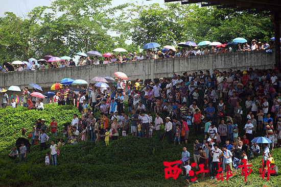 化婆婆來自蒼梧縣旺甫鎮車頭村,她說,當天本來打算到梧州市區辦事,后來聽說西江正在舉行龍舟賽,于是就趕來防洪堤觀看。她說,小時候家里管得很嚴格,不準她獨自出門,所以幾乎沒看過龍船。“現在能圓龍舟夢,真是高興。”化婆婆說。