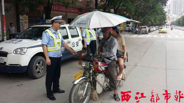 ????西江都市報訊 (記者 楊珊 通訊員 廖媛) 近段時間,梧州市氣溫居高不下,摩托車、助力車等兩輪車違法加裝遮陽傘的現象逐漸抬頭。對此,梧州市公安交警支隊龍圩大隊開展整治,對兩輪車“打傘”行為見一把拆一把。