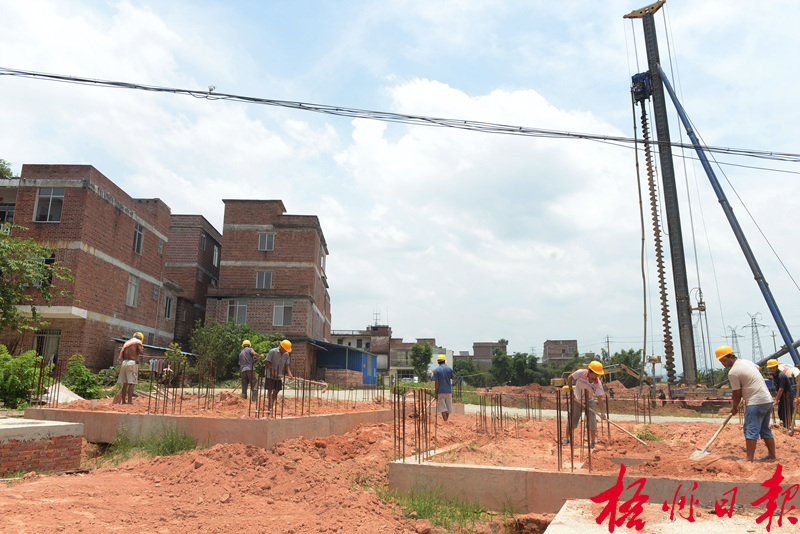 ????7月3日,在長(zhǎng)洲區(qū)正陽村正陽南北堤移民安置點(diǎn),施工隊(duì)正開展房屋基礎(chǔ)施工。