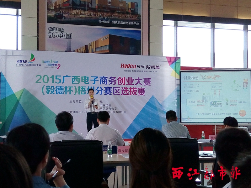 ??? 西江都市報訊 (記者 朱元冬 通訊員 黃飛飛) 7月20日上午,2015年廣西電子商務(wù)創(chuàng)業(yè)大賽(毅德杯)梧州分賽區(qū)選拔賽,在梧州毅德商貿(mào)物流城招商中心舉行。比賽中,戰(zhàn)狼團隊、“螞蟻”網(wǎng)絡(luò)、梧州納盈科技有限責(zé)任公司等10支隊伍脫穎而出,他們將代表梧州市參加廣西區(qū)的決賽。
