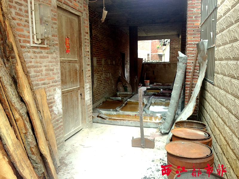 ????7月20日上午,記者到竹灣村五組5號走訪,發(fā)現(xiàn)網(wǎng)友所指的居民樓從外表上看,是一棟普通磚混結(jié)構(gòu)的住房,其周圍是較為密集的住宅區(qū)。記者走近觀察,發(fā)現(xiàn)房子里堆放著許多粉紅色的化學(xué)藥劑,院子里堆放著十幾個鐵桶,看上去很像一家小型加工廠。而房屋的住戶對于記者的來訪顯得很警惕,不停詢問記者的身份和此行目的。