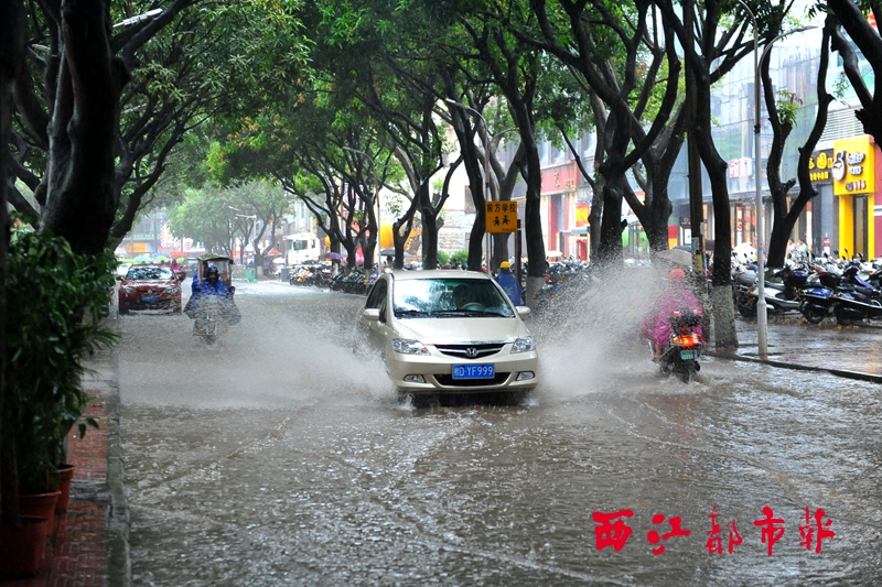 7月21日,小汽車和電動車在大學(xué)路的積水區(qū)域中行駛,濺起高高的水花。當日下午4時許,梧州市區(qū)內(nèi)突降大雨。大雨之下,大學(xué)路梧州一中初中部門前的近百米道路成了“小河”。 西江都市報記者 何鎏/攝
