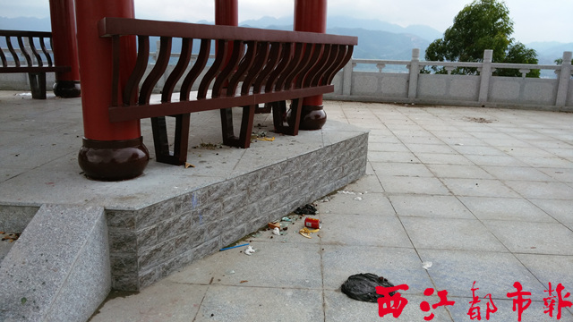 在東山公園的觀景臺上,果皮、塑料袋等垃圾隨處可見。蒙敏瑩/攝