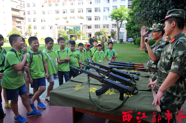 ??? 7月29日,武警官兵向前來參觀的小記者介紹各種槍支知識。當日,在中國人民解放軍建軍88周年即將來臨之際,近20名梧州日報社小記者實踐提高班的學員來到廣西公安邊防總隊梧州邊防檢查站營地,用紙筆和相機記錄下邊檢站的警營文化。 西江都市報記者 何 鎏/攝