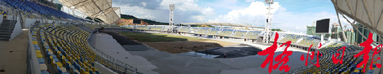 ????目前,紅嶺體育場足球場7000多平方米草皮基本完成鋪植,施工單位正加緊場館的內外綠化、塑膠跑道噴塑、道路廣場地磚鋪設等收尾工作。李煜榮 攝