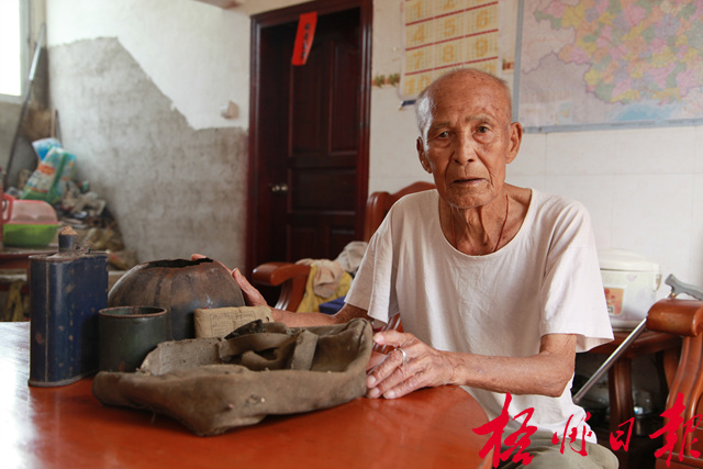 今年94歲的陀發(fā)軒老人至今仍保存著當(dāng)年作戰(zhàn)時(shí)所用的水壺、背包等行軍用品。
