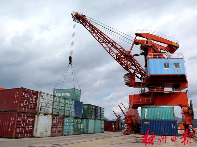 ??? 7月29日,在梧州港赤水圩作業區碼頭,起重機械正吊運集裝箱。