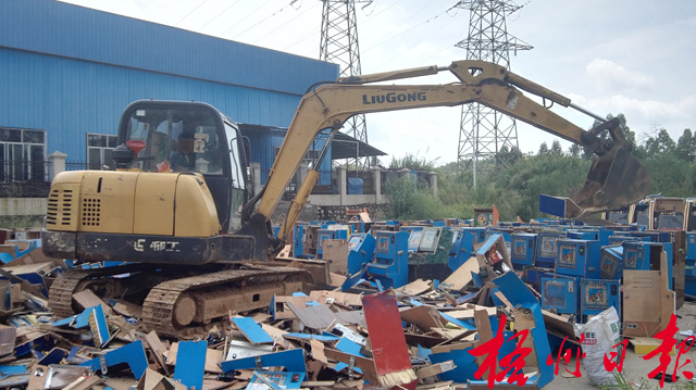 ????8月13日上午,在龍圩區工業園再生資源回收中心,市公安局龍圩區分局旁集中銷毀具有賭博性質的游戲機440余臺。