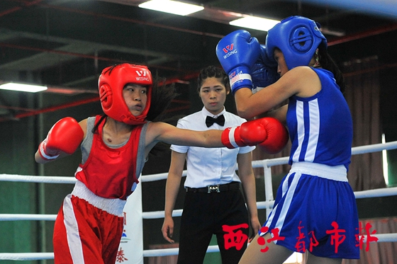 ????與網球項目相比,當天下午開賽的拳擊項目則更富有激情。一走進梧州市綜合館,兩塊一米多高的正方形拳擊臺就立刻吸引了眾人的眼光。比賽過程中,臺上選手的一舉一動總能引來臺下觀眾的陣陣歡呼聲,令人感到熱血沸騰。據介紹,這也是梧州市首次接辦拳擊賽事。