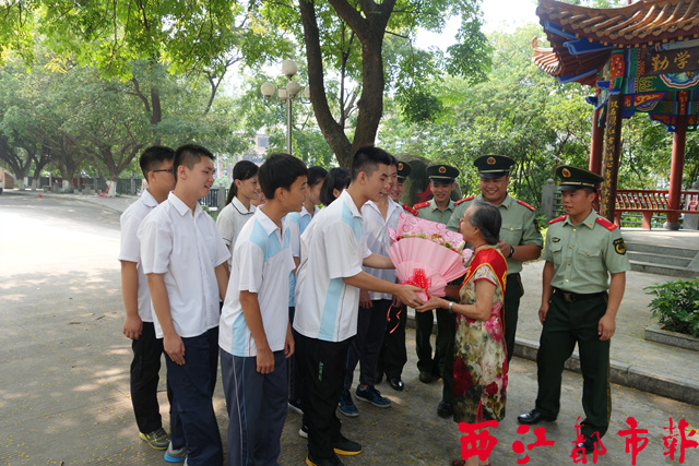 梧州一中高中部的新生代表和梧州邊檢站官兵一起,向歐潔芳老人贈送獻(xiàn)花表示敬意。西江都市報記者 龍?zhí)靷?攝