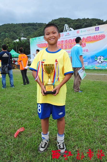 今年7月,在梧州市舉行的兩岸十地國際青少年足球邀請賽上,黃羽飛作為大東小學足球隊的隊長上臺領獎。?