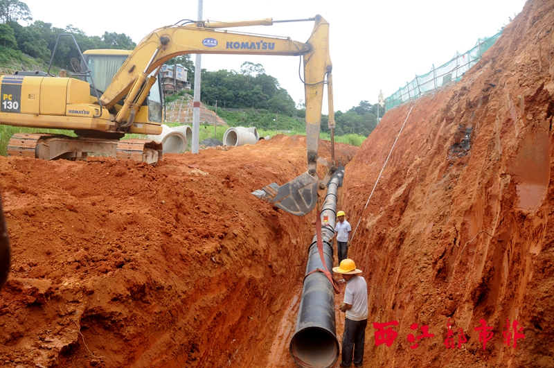 ???? 8月30日,在萬秀區白云路擴建項目建設現場,工人們正在鋪設供水管道。