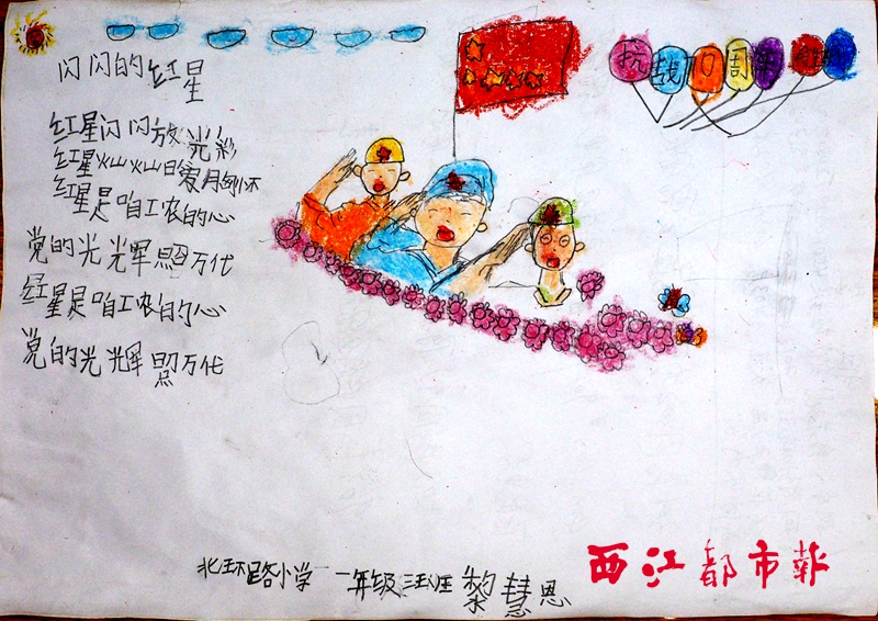 開學第一天,小慧恩交上的第一份作業是一幅反映抗日戰爭勝利題材的手抄畫。