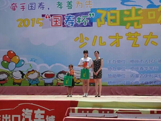 由中國人壽梧州分公司與梧州人民廣播電臺聯合舉辦的2015“牽手國壽 孝善為先” 第二屆陽光哆來咪少兒綜合才藝比賽于8月18日—8月20日分別舉行樂器組、歌舞組比賽。8月22日在梧州市鴛江麗港表演舞臺舉行樂器組、歌舞組以及市級書畫類一、二、三等獎頒獎典禮。