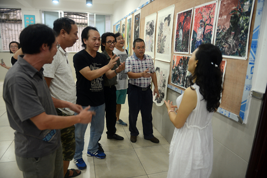 ???9月12日,在中國(guó)人民銀行梧州市中心支行職工活動(dòng)室,梧州美術(shù)作者們正討論交流繪畫技法。 當(dāng)日,梧州美術(shù)作者們參加“我負(fù)丹青異域行”梧州繪畫作品法國(guó)展回顧研討沙龍,開展學(xué)術(shù)交流。據(jù)了解,此次沙龍由新一屆市美術(shù)家協(xié)會(huì)組織舉辦,結(jié)合我市出國(guó)參加聯(lián)展的美術(shù)作品,就運(yùn)用中國(guó)畫繪畫元素和理念、西方表現(xiàn)主義繪畫形式創(chuàng)作等展開研討。李煜榮 攝