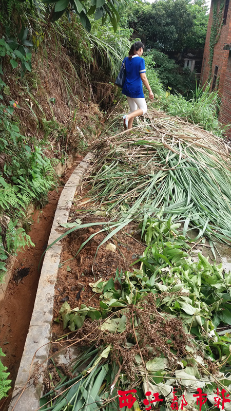 西江都市報訊(記者 紀榮蘭 通訊員 梁月芬 邵素群)近段時間以來,天氣多變,雨水充足。一位住在東山里三級的居民反映,他居住的房屋后面的環山渠被黃泥堵塞,導致雨水無法從環山渠排走,山頂上的黃泥水直接從渠面順著屋后擋土墻流到他家二樓。該居民擔心以后再下大雨時,環山渠來不及排水,雨水會沖入屋內,危及生命和財產安全。