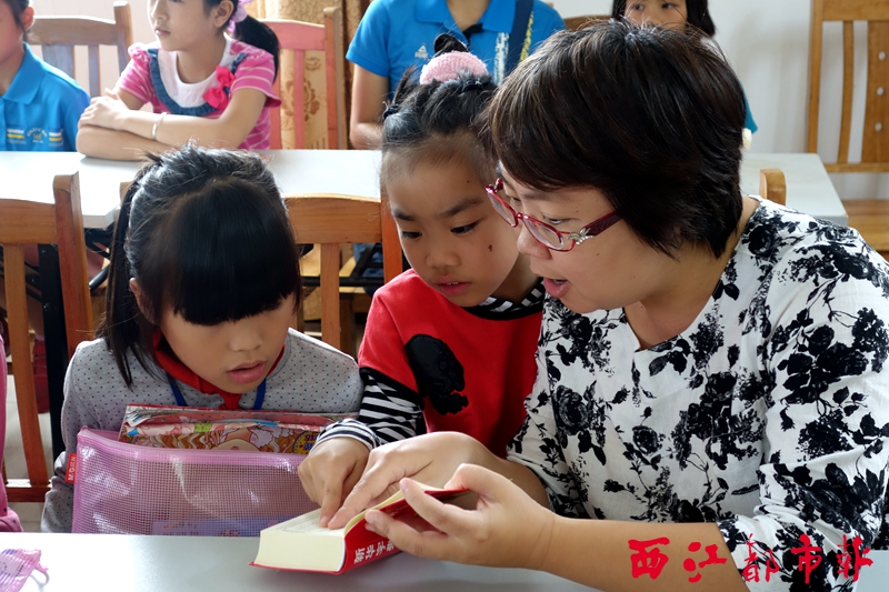 愛心家庭代表指導(dǎo)路垌村的困難兒童如何使用新華字典。