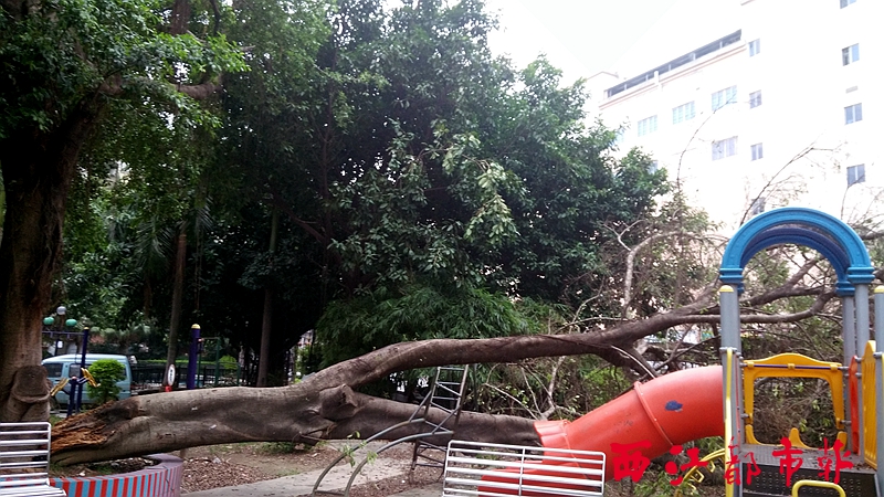 陽光花園小區(qū)內(nèi)倒下的榕樹壓壞了部分游樂設(shè)施。 蒙敏瑩/攝