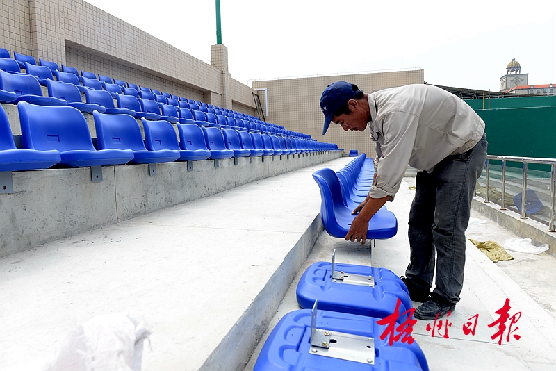 ??? 9月14日,在市網(wǎng)球中心,工人正在安裝座椅。