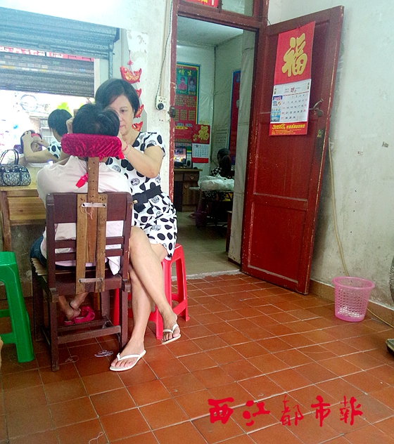 ????在東正路、新興一路勝隆里、步埠路以及下三云路等街巷,記者均發(fā)現(xiàn)了這種傳統(tǒng)美容術(shù)的蹤影,捻面師傅大多是四五十歲的“老梧州”,多為女性,手藝主要從她們家中上一輩的老人家身上習(xí)得,仿佛是一種“家族生意”。每家店面均積聚有一定的人氣,愛美的“擁躉”也大多相識,在等候美容的時候,排坐在室內(nèi)的木凳上相互打趣、閑聊。